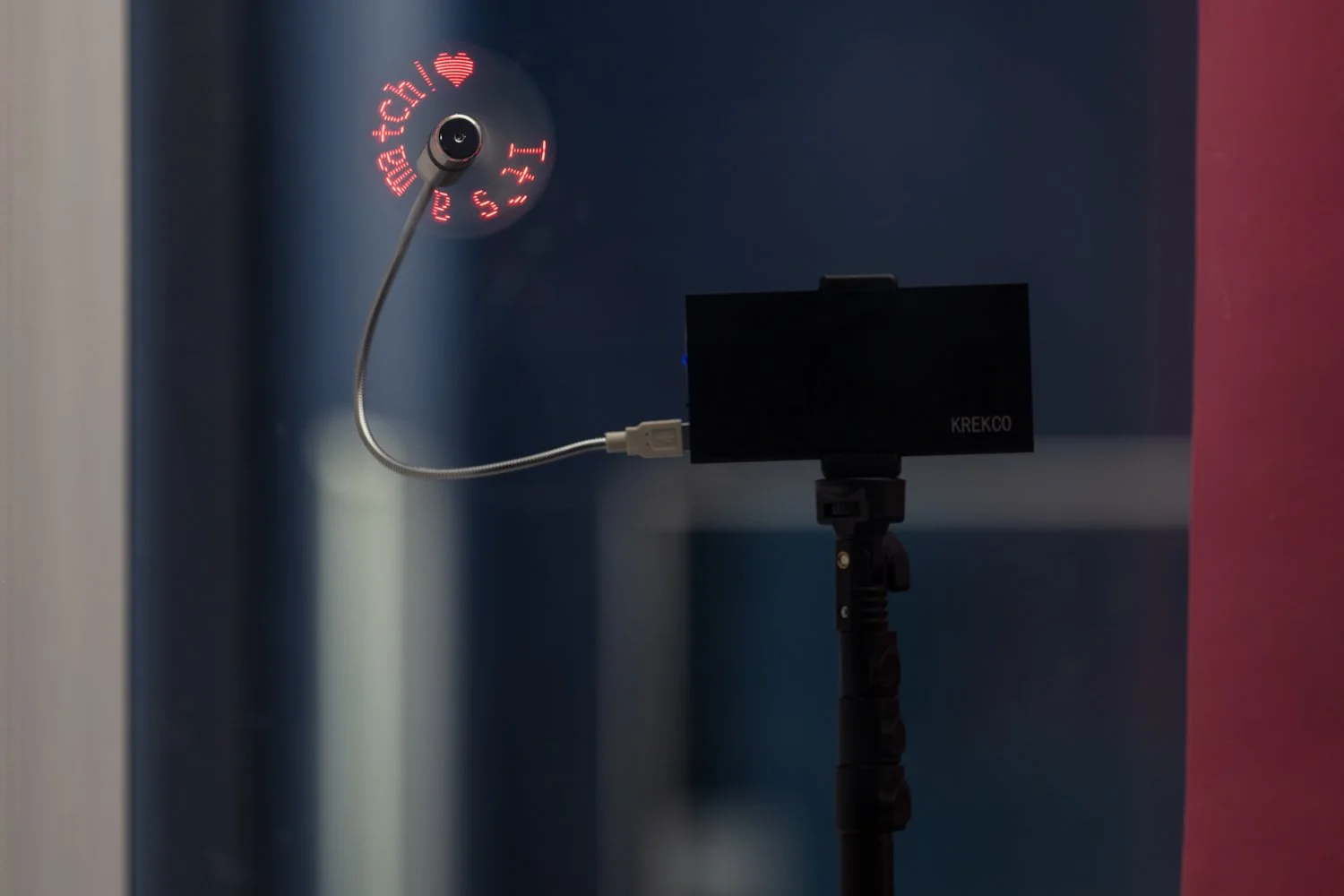 A digital sculpture which mirrors the bombardment of messages, notifications and thoughts experienced by all of us on a daily basis. The rotating, luminous text including snippets of thoughts, text messages and other daily information acts here as a shorthand of the experience of anxiety, and points to the hypnotic and frenetic nature of the stream of information offered by our devices.