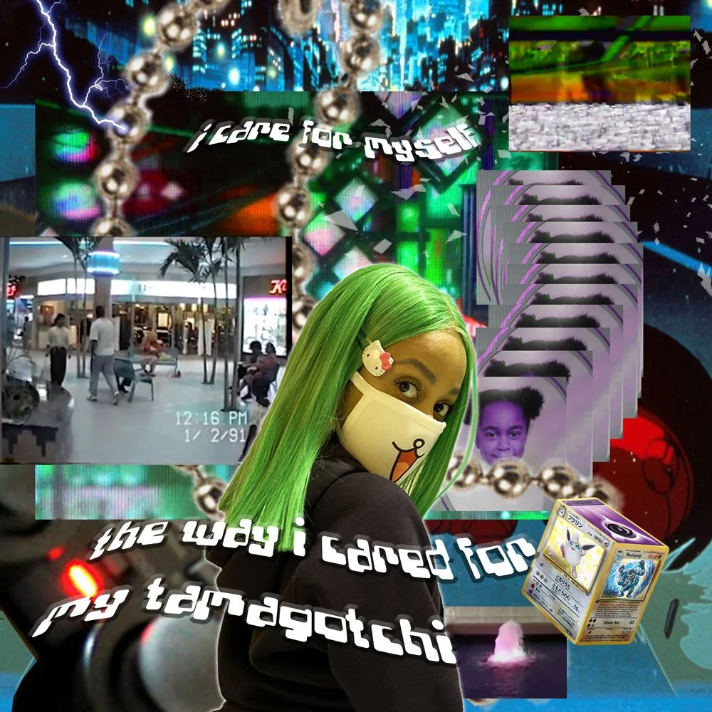 The piece is a digital collage featuring imagery of cityscapes and childhood play, and looped videos of footage filmed in a shopping mall in the 90s. The text reads ‘I care for myself the way I cared for my Tamagotchi’, relating to the nostalgia of my first experience of caring for another being, which happened to be a digital pet. The piece also interrogates the power of escapism, defining one’s own personhood, the haunting of past eras as we experience late stage capitalism, and the phenomenon of growing up right as the analogue was giving way to the digital.