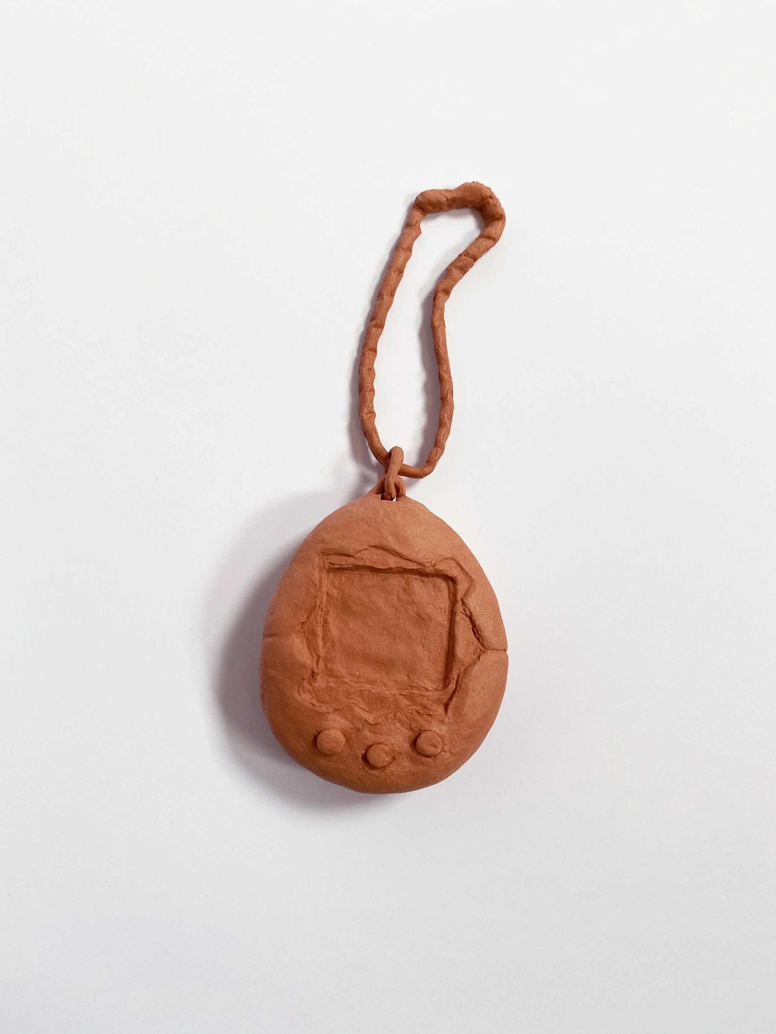 A clay model of my childhood Tamagotchi, which I kept for sentimental value. The cyber-pet represents an early foray into digital worlds and handheld devices, as well as caring responsibilities. Nostalgia is expressed through its imperfect replication in clay, as if it were an archaeological find.